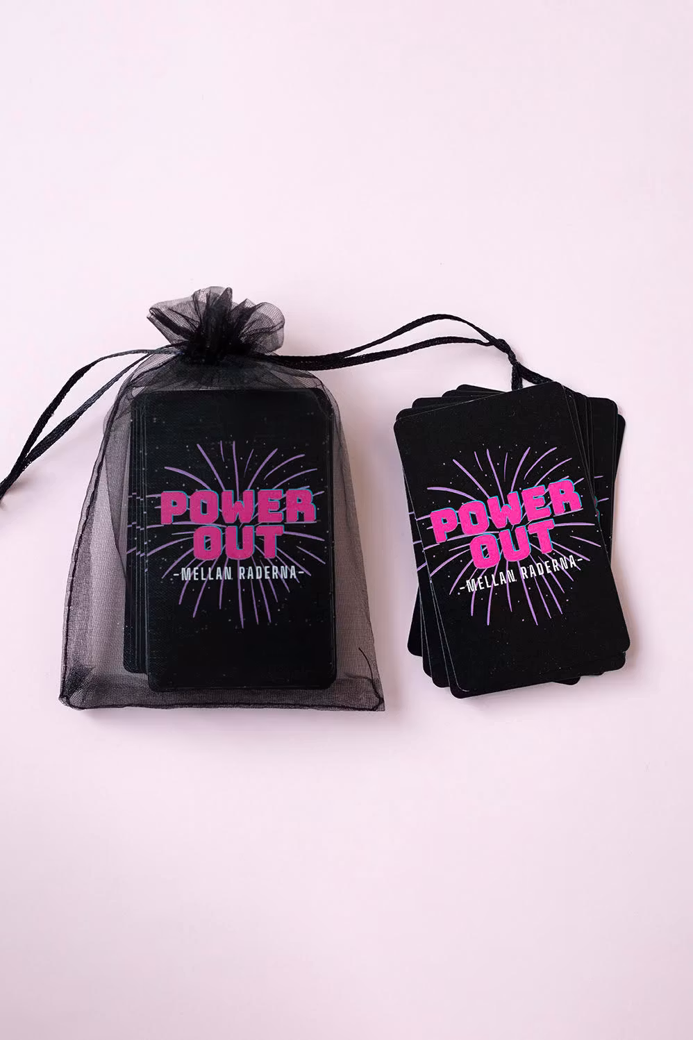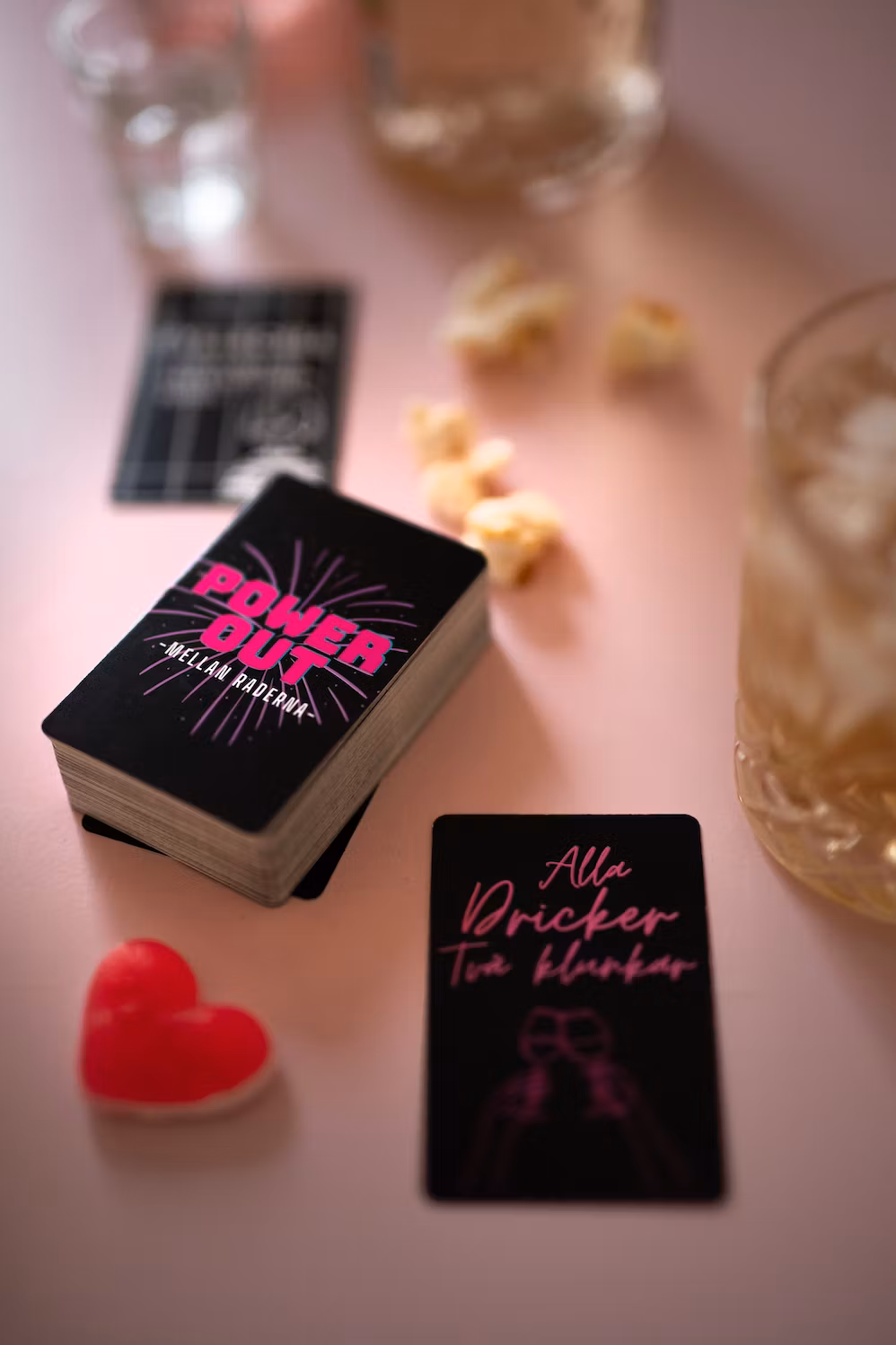 Powerout: Festspelet för alla tillställningar. Kortleken består av 60 kort med olika utmaningar, frågor och lekar, perfekta för festen. Reglerna är enkla! Gå varvet runt, ta upp ett kort och besvara eller utför utmaningen. Vill du inte svara på en fråga eller göra utmaningen tar du ditt straff i klunkar. I kortleken finner du möjligheten att sätta dina kompisar i fyllecell, svepa en och annan drink och få svar på vem som troligast kommer att ha en "suger daddy" i framtiden. Kortlekarna går att kombinera med varandra.